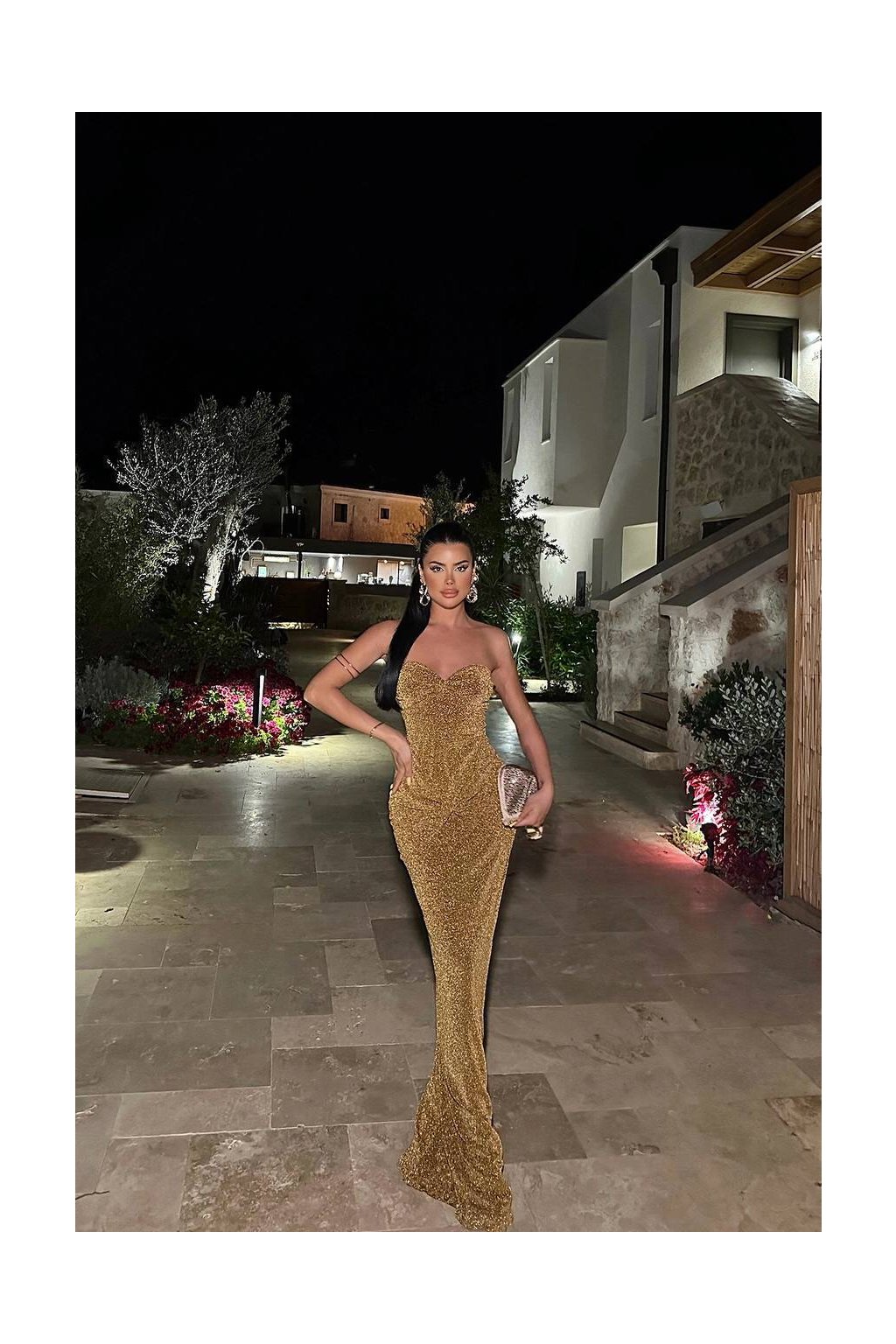 Golden Allure – Trblietavé zlaté večerné šaty bez ramienok