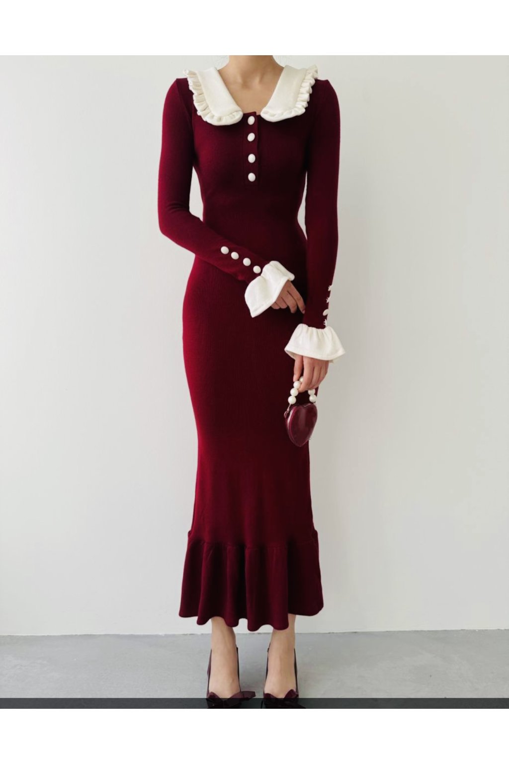 Elegantné bordové midi šaty s kontrastným bielym golierom a manžetami, perleťovými gombíkmi a volánovým lemom. Jemne elastický materiál formuje ženskú siluetu – ideálne na spoločenské udalosti a večerné stretnutia.