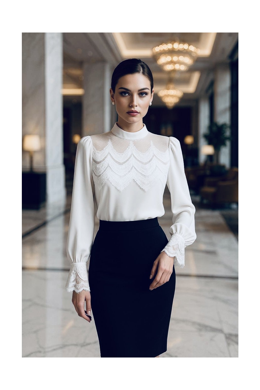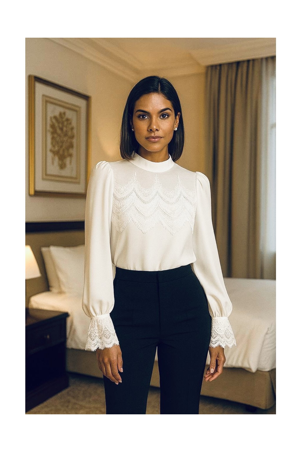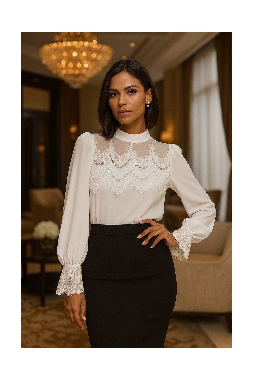 Premium feel- Elegantná blúzka s čipkovanými detailmi a dlhými rukávmi.