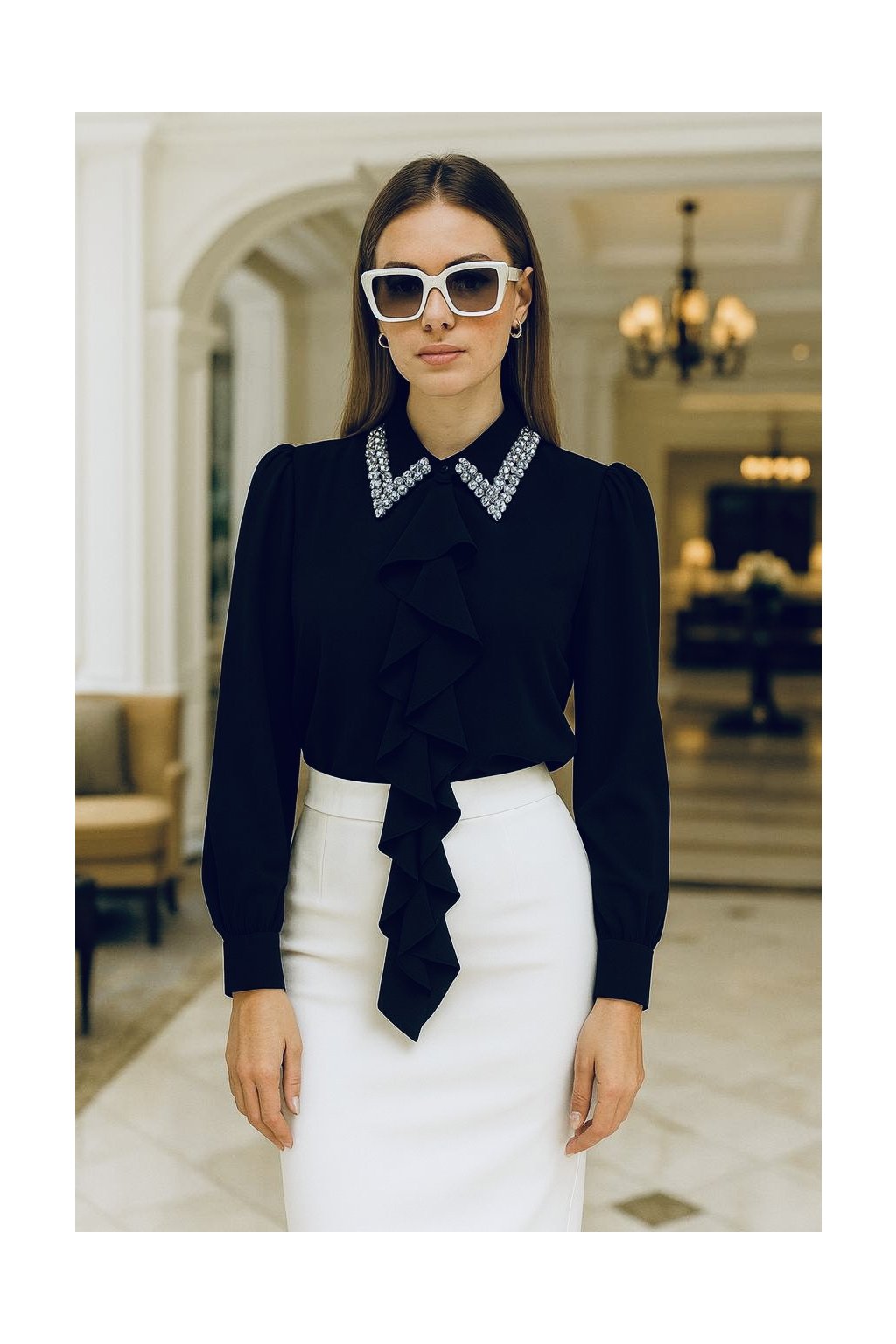 Elegantná čierna blúzka s kryštálovým golierom a volánovým detailom