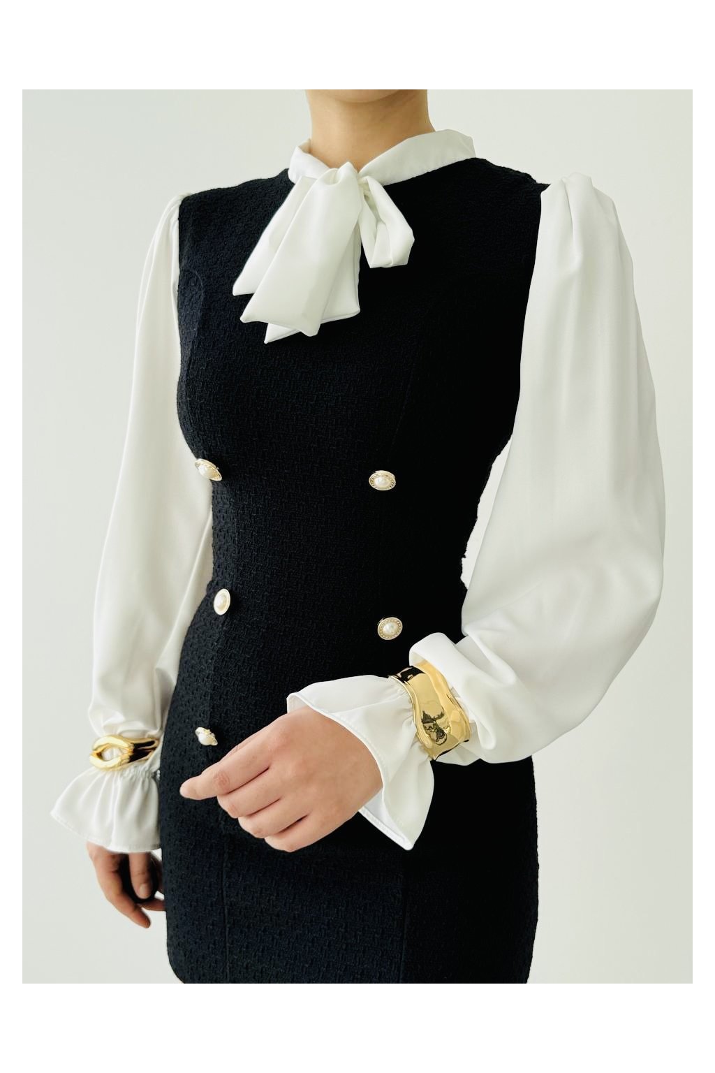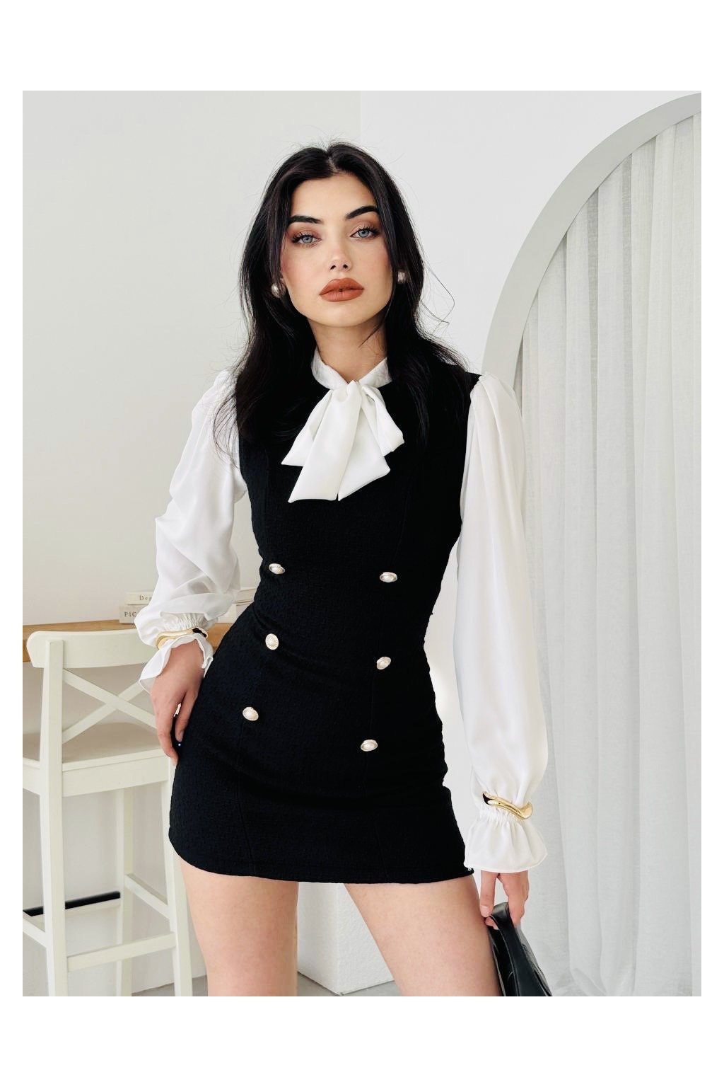 Vstúp do sveta, kde móda hovorí rečou elegancie. Ikonické čierno-biele minišaty s mašľou sú ódou na ženskosť, štýl a sebavedomie. Zmyselný čierny, korzetový živôtik zvýrazní siluetu, zatiaľ čo biela blúzka s dramatickou mašľou prináša noblesu a jemnú rafinovanosť.