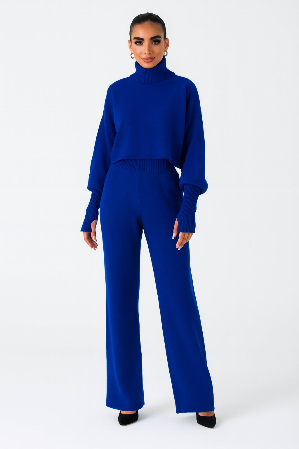 Luxusná modrá dámska tepláková súprava s voľným strihom a vysokým pásom