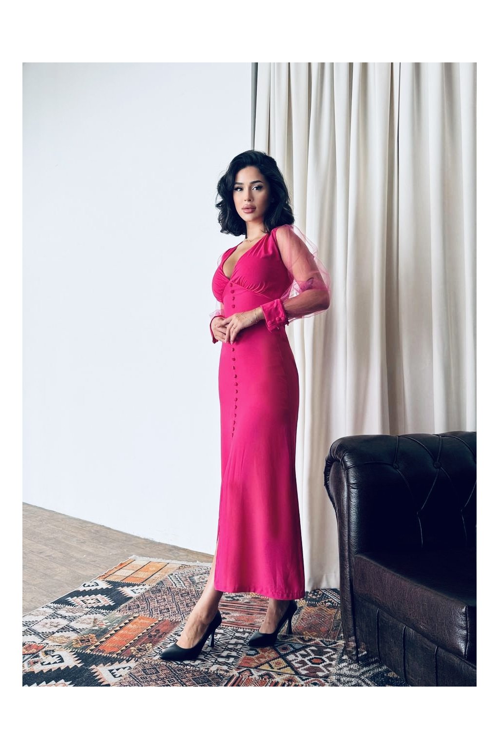 Jemne priliehavý strih vytvára čistú a zmyselnú siluetu, zatiaľ čo dlhá dĺžka pôsobí elegantne a sofistikovane. Saténový materiál s jemným leskom krásne odráža svetlo a dodáva šatám exkluzívny vzhľad, tylové rukávy pritom prinášajú ľahkosť a romantický nádych.