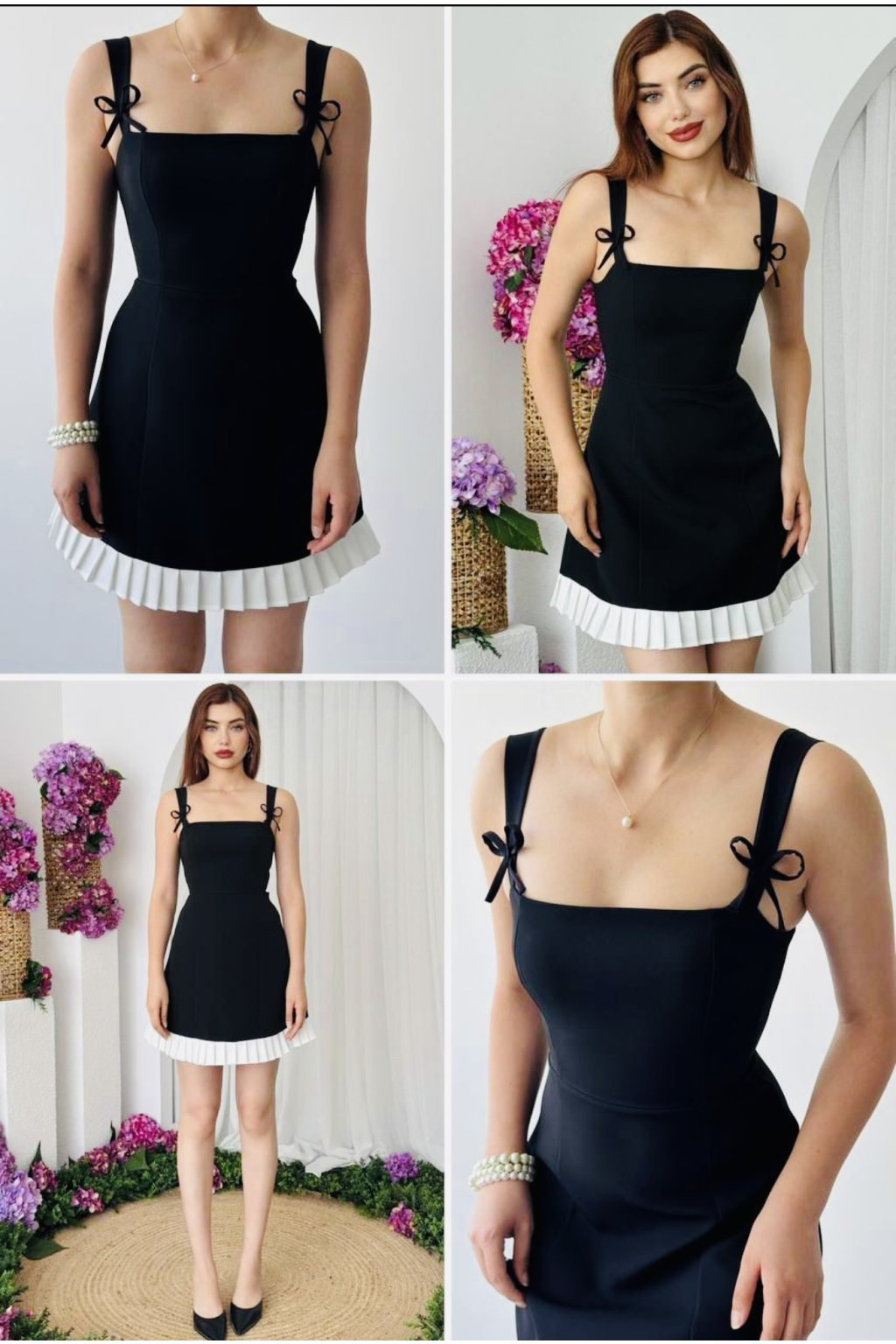Tieto čierne šaty s bielym plisovaným lemom sú stelesnením elegancie s hravým dotykom. Mašličky na ramienkach, dokonale tvarovaný strih a kontrastný spodný lem vytvárajú outfit, ktorý zaujme svojou čistotou aj šarmom.