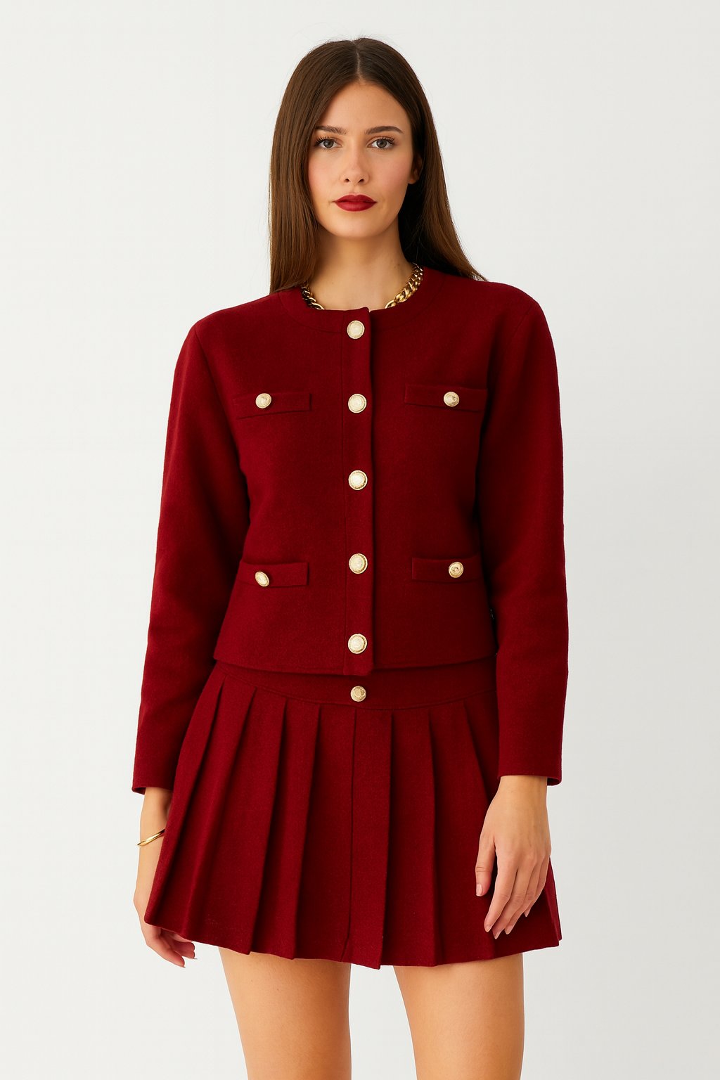 Plisé luxus- Komplet pozostávajúci z plisovanej sukne a tmavočerveného saka so zlatými gombíkmi.
